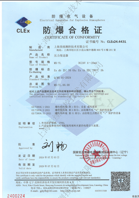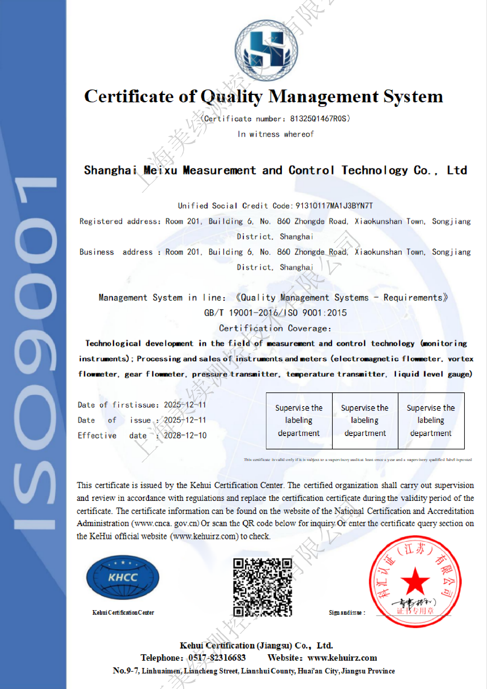 上海美续测控技术有限公司位于具有“上海之根”称号的松江区,从事医药,食品,化工,污水处理等行业压力变送器、温度变送器、差压变送器、液位变送器及流量计的开发与制造,是一家集研发、生产、销售及相关服务为一体的现代化企业。 目前,公司是上海仪器仪表协会会员,已通过ISO9001质量管理体系认证,CE认证及3A信用认证,产品压力、温度、液位计、流量计均获得了粉尘和隔爆认证资质,SIL安全认证,并荣选为《中国*》。 “永远站在客户的角度想问题”是我们美续的服务口号,也是我们一直以来的经营的理念和宗旨!